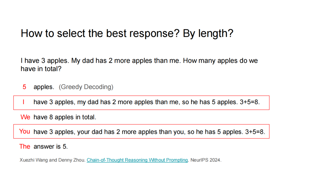 不过,Denny Zhou和Xuezhi Wang在《Chain-of-Thought Reasoning Without Prompting》一文中提出其实不用这些提示,只要改变模型的解码方式,就能让预训练的语言模型展现出推理能力。