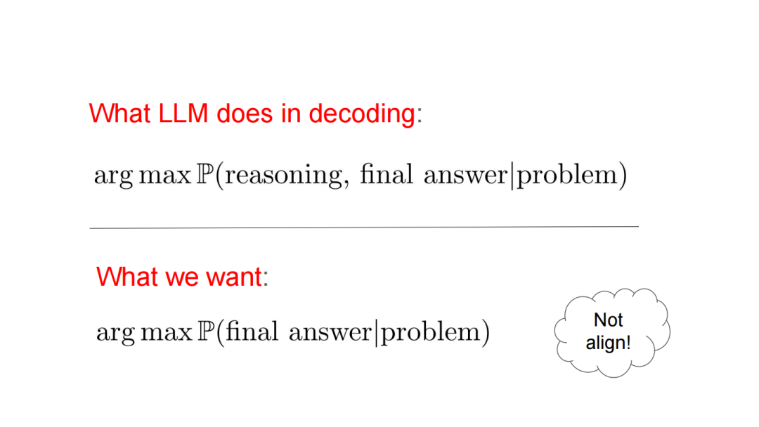 LLM是概率模型,其解码时追求的是在给定问题下推理和最终答案的联合概率最大,而我们想要的是给定问题下最终答案的概率最大,两者并不一致。