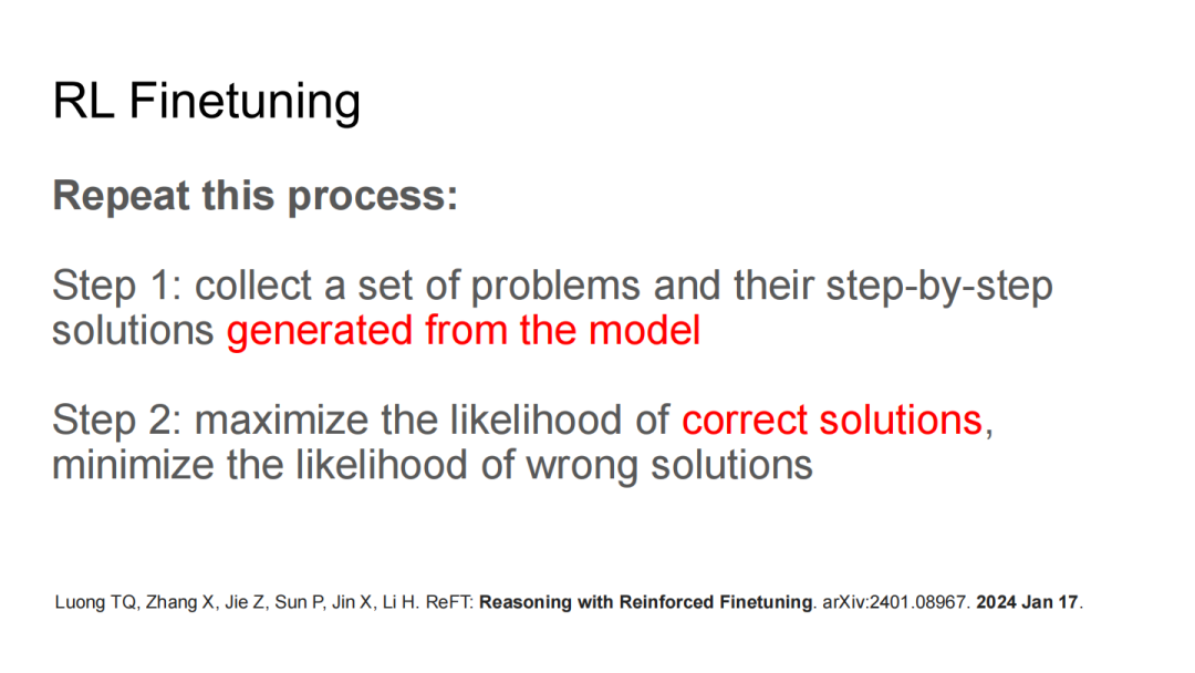 于是,研究人员对监督微调进行了改进,一种是自我改进,让模型自己生成步骤和答案,然后用正确的那些训练自己,有点像学生自己做题纠错。