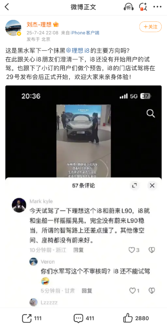 7月24日晚间,理想汽车副总裁刘杰在社交媒体上晒出一张截图,指控有“黑水军”抹黑理想i8。根据其晒出的截图,评论中某网友评论“试驾理想i8和蔚来L90,i8感觉和坐船一样摇摇晃晃,完全没有蔚来L90稳当,所谓的智驾路上还差点撞了”等评价。