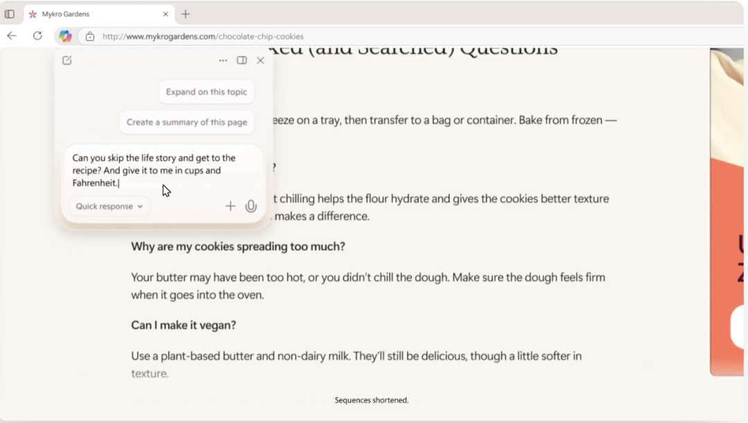 在浏览网页的过程中,也可以随时唤出Copilot提问,如跳过食谱分享博客中的故事部分,直接提取食谱并转换成华氏度等习惯的计量单位。