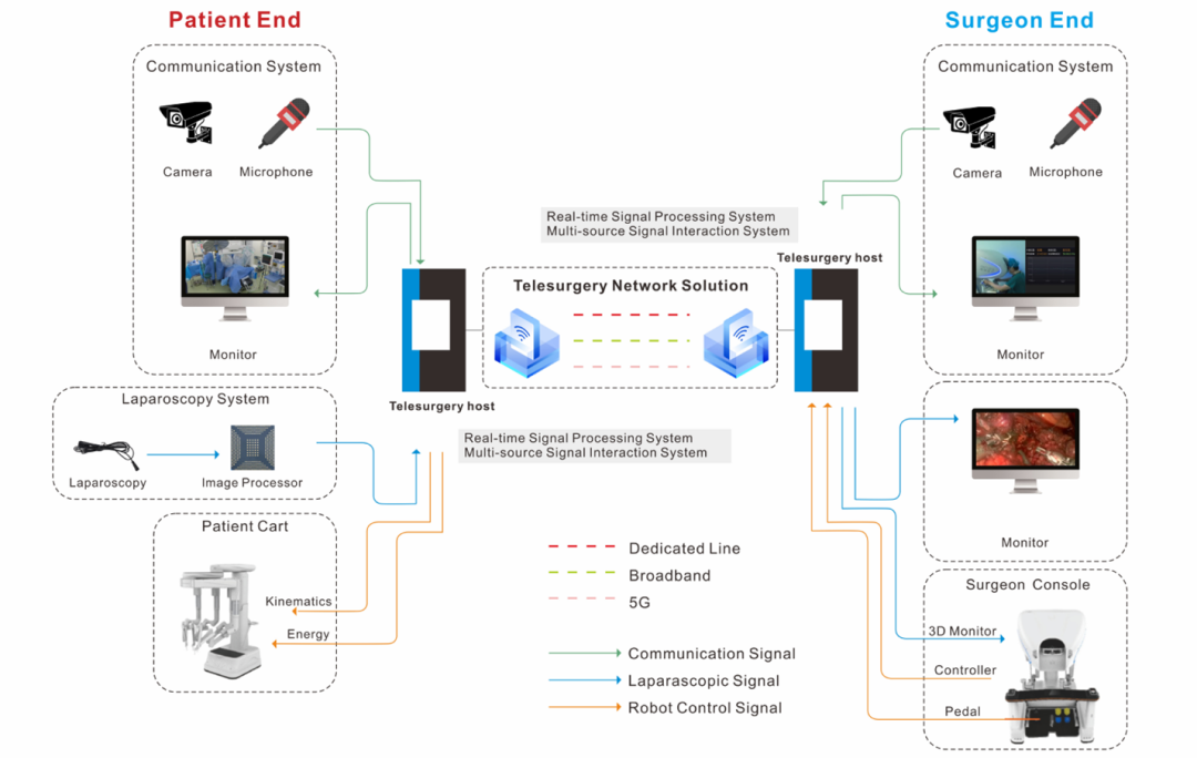 研究于2024年6月至9月间进行,利用精锋®机器人远程手术系统,在中国地理位置相距450公里至2200公里的合肥、北京、杭州、哈尔滨四家顶尖医院之间,成功为18例泌尿肿瘤患者(7例行机器人辅助腹腔镜肾部分切除术,11例行根治性前列腺切除术)实施了远程手术。成功率100%, 所有18例远程手术均顺利完成,无术中转本地开台;网络性能卓越, 关键指标远低于安全阈值:平均实时网络延迟仅38.38±13.25毫秒(远低于外科手术可接受的200毫秒阈值),网络抖动低至0.39±0.29毫秒,视频编解码延迟20.02±0.06毫秒,全程零帧丢失,标志着我国在高端医疗装备和智慧医疗领域取得里程碑式突破,是中国在远程外科领域实现了从技术探索走向成熟临床应用的重大跨越,为全球的远程医疗技术发展提供了重要的参考和借鉴。