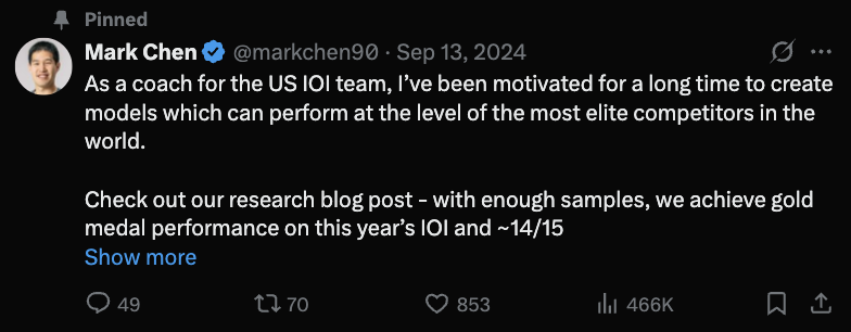 也许这种默契来源于他们都曾参与过国际编码比赛,Chen还是美国计算机奥林匹克队的教练,这也影响了OpenAI积极参与国际赛事的战略部署。