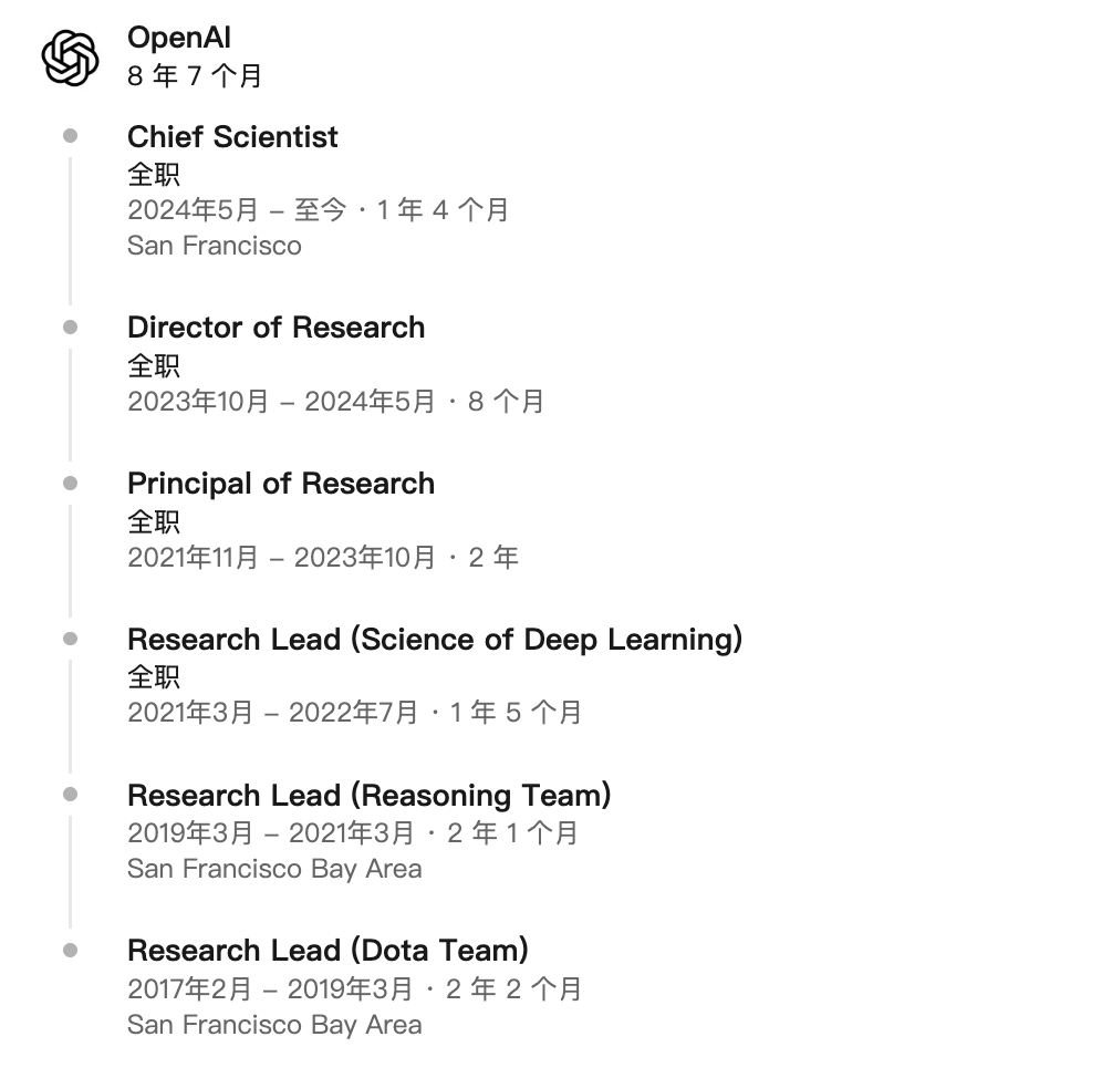 2024年,在他导师llya离职后被提升为首席科学家,负责监督GPT-4和o1等项目,曾被奥特曼称赞为“我们这一代最杰出的头脑之一”。