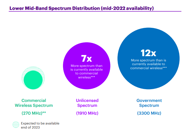 根据美国无线通信与互联网协会(CTIA)的统计,在3GHz-8.4GHz中低频段频谱中,移动通信行业的商用频谱仅占比约 5% ,免许可使用的频谱占比约 35%,而由美国联邦政府(含军方)控制的频谱占比高达60%,是移动商用频谱的12倍;并且自从FCC的频谱拍卖权于2023年初到期后,移动通信行业就再没有获得任何新增频谱。