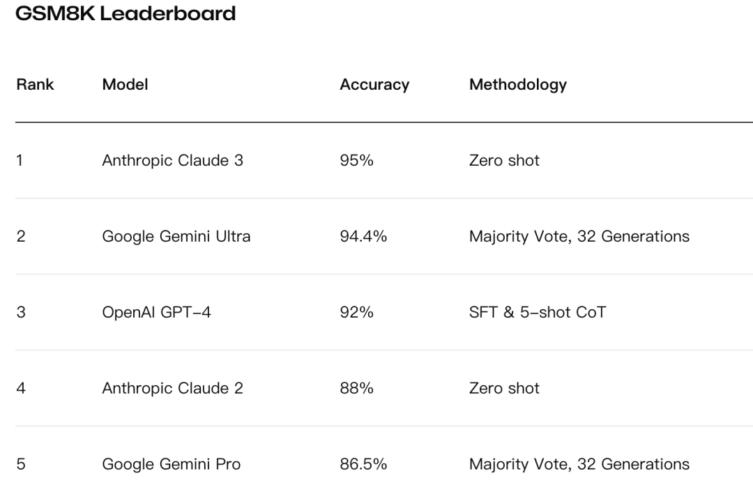 GSM8K,即小学数学8K,是一个包含8,500个高质量、语言多样的小学数学应用题的数据集。目前,此数据集的成绩已经饱和:Claude 3 准确率已达95%