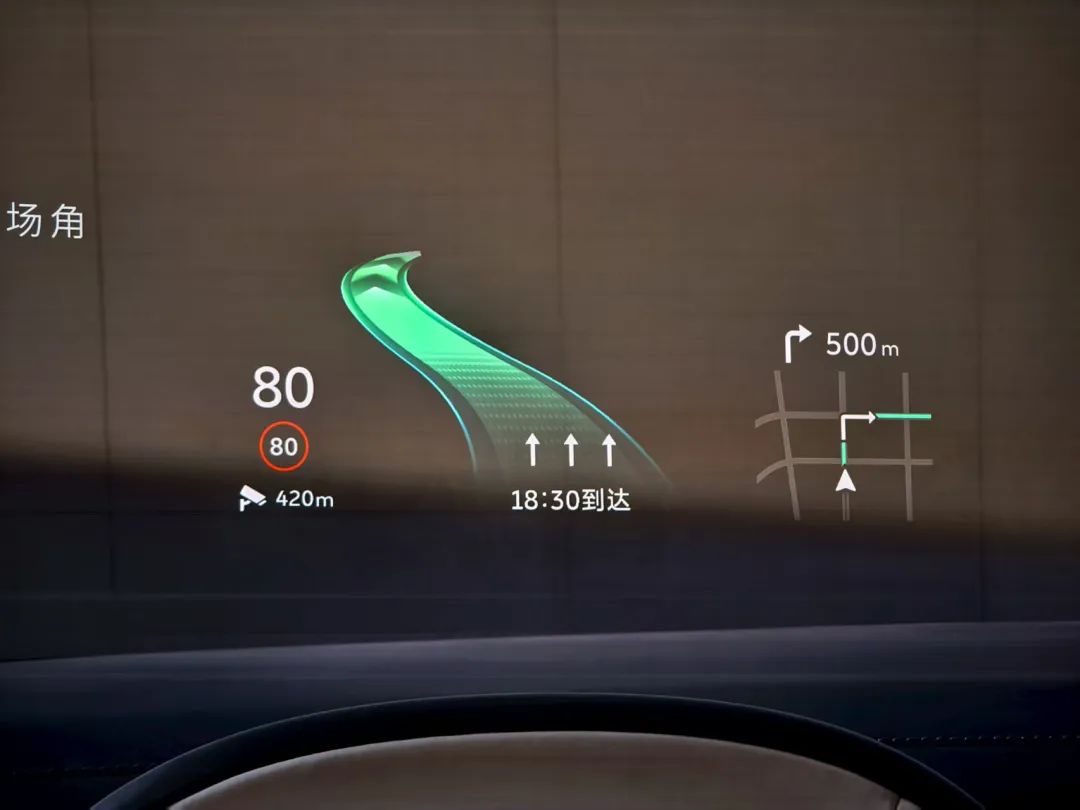 行车时还有38英寸AR-HUD,最大投影距离4米,可以显示转向、车速、摄像头距离等。