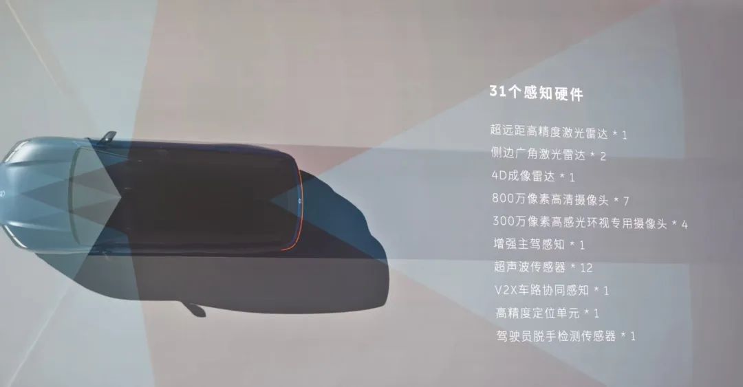 更高清的感知数据,为更安全的辅助驾驶决策提供了基础。再加上还有31个感知硬件,对齐了80万级的ET9,包括3个激光雷达,1个4D成像雷达。
