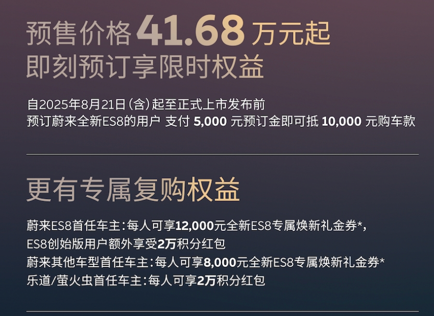 就在昨晚,全新蔚来ES8预售,整车购买价格41.68-45.68万元,BaaS方案购买价格30.88万元起。