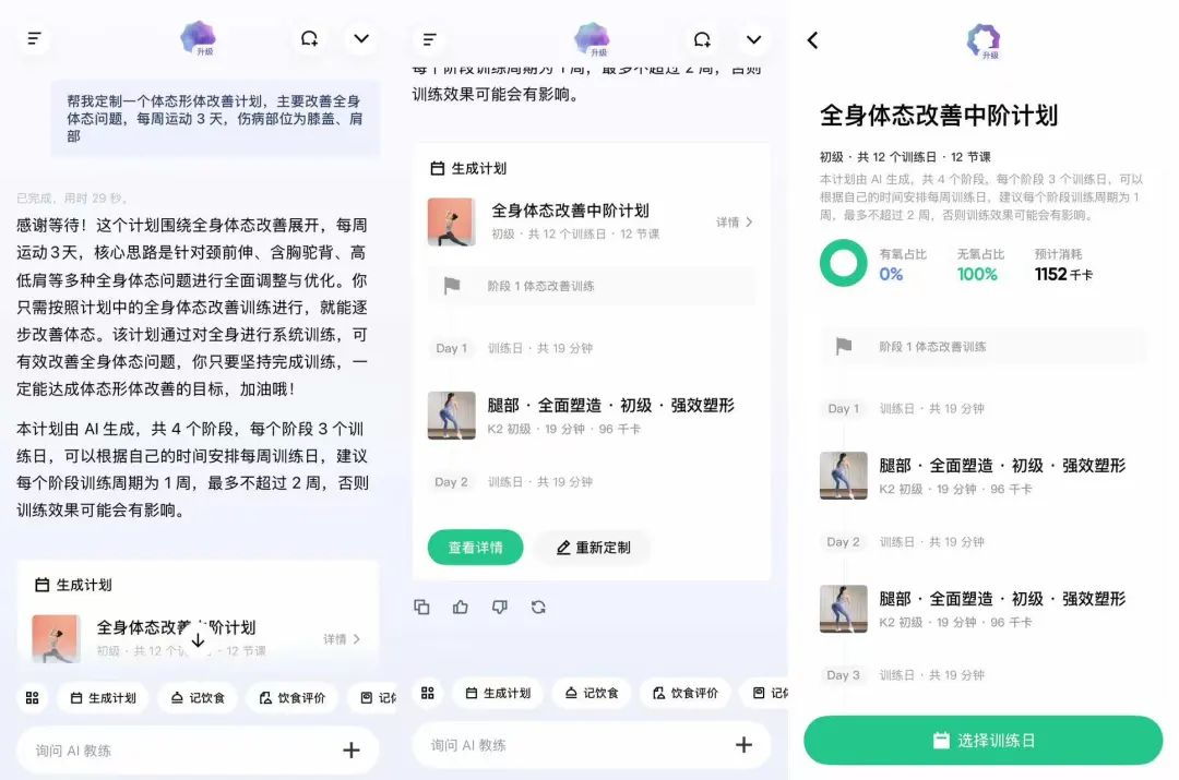 从3月首次推出AI教练卡卡(Kaka)到现在,卡卡完成了多次功能迭代,不仅能示范指导,也涵盖个性化训练计划生成、语音导练、饮食记录分析等等功能。