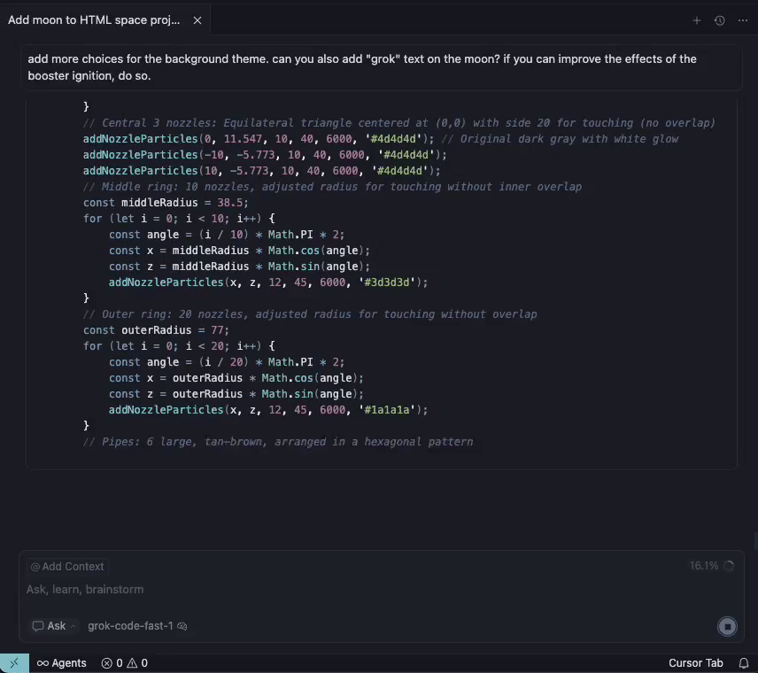 网友认为,Grok Code的一次性输出的代码量最丰富,在如下星舰模拟演示中,效果着实令人惊艳。