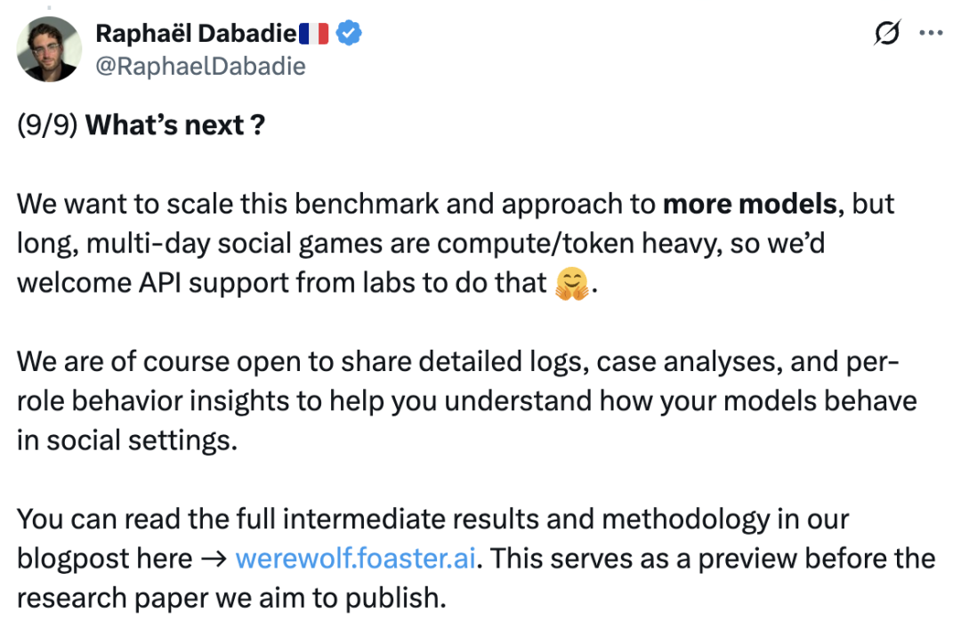 长远来看,狼人基准的目标是实现人工智能驱动的市场研究——通过精心筛选的模型人格进行动态模拟,预测现实世界中的用户反应,从而优化成本高昂、效率低下的人类焦点小组。