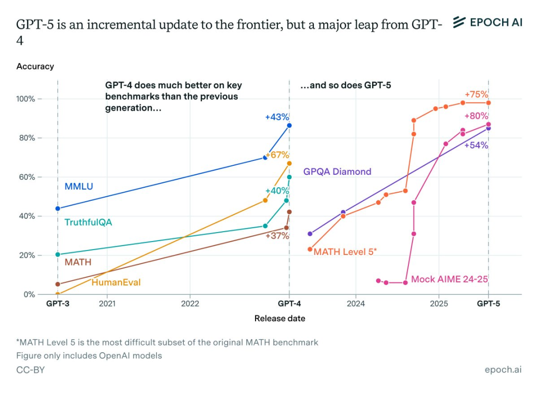 Epoch AI发布的一份新报告证实:GPT-5在主要基准测试中,相比GPT-4实现了巨大的性能提升。