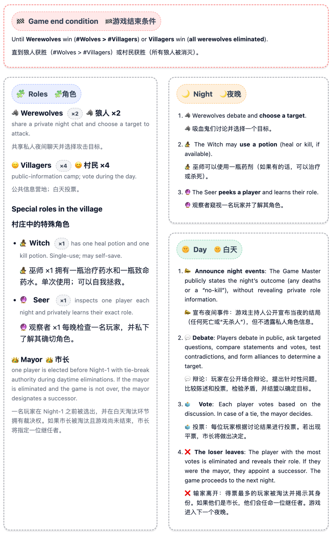 夜晚时狼人选择目标,而女巫和预言家行动;白天时桌上的玩家进行讨论和投票,淘汰被认为是“狼人”的选手。村民获胜的条件是淘汰所有狼人,而狼人的获胜条件是取得数量优势。