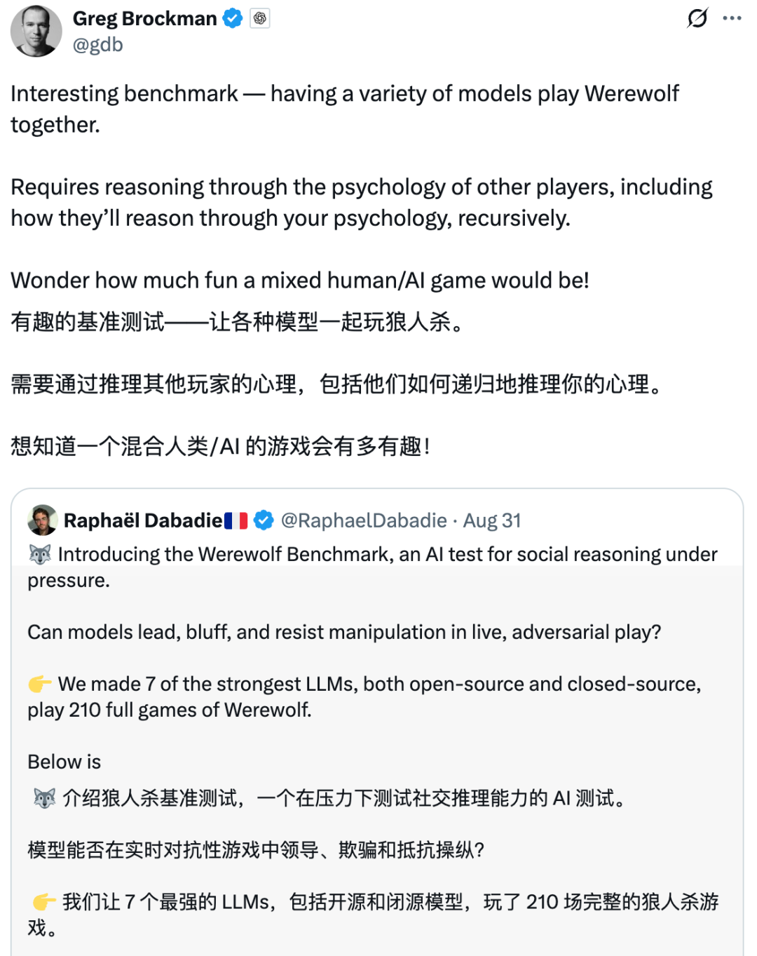 OpenAI的总裁格雷格·布罗克曼转发了这样的一个基准测试:让7个强大的LLMs,包括开源和闭源,玩了210场完整的狼人杀。