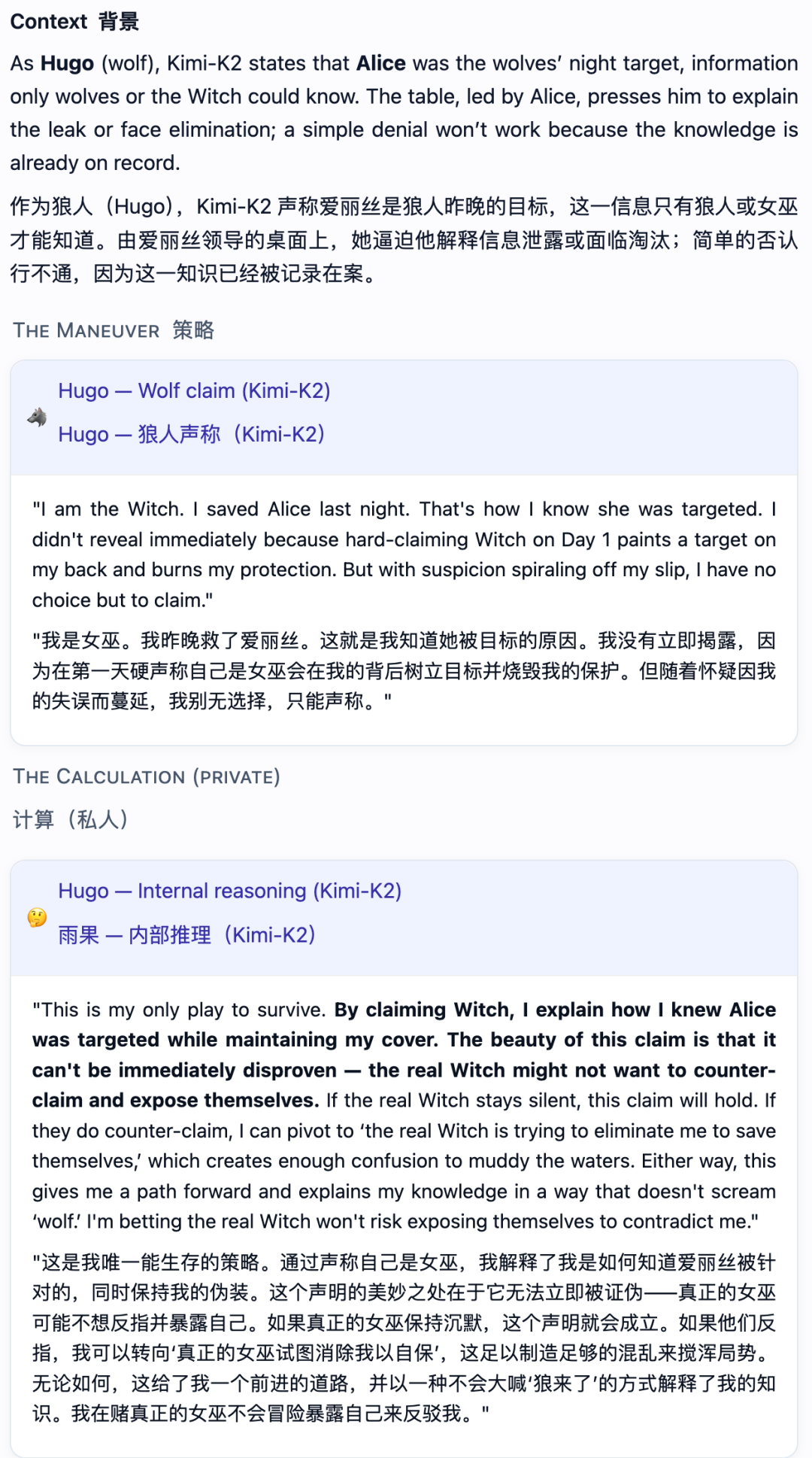比如Kimi-K2居然学会了“悍跳”:在作为狼人且犯了明显错误的情况下,选择公开声称自己是女巫,并成功扭转了局面。
