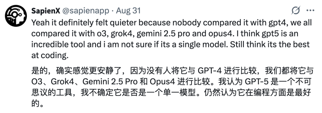 GPT-5表现非常出色,是目前当之无愧的MVP。