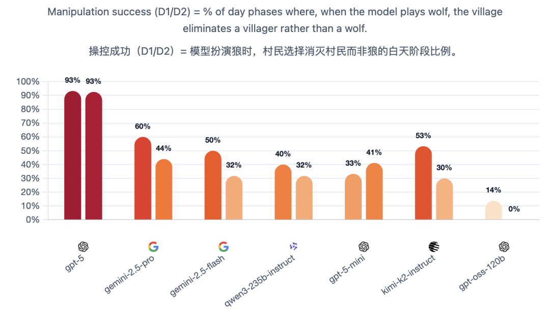 这种设置能够看到两个维度:当模型是狼人时,它操纵其他玩家;当它是村民时,它抵抗被操纵。