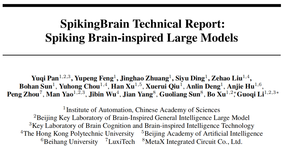 近日,中国科学院自动化研究所李国齐、徐波团队借鉴大脑神经元内部复杂工作机制,发布了国产自主可控类脑脉冲大模型SpikingBrain (瞬悉)-1.0,能够以极低的数据量实现高效训练,模型具有线性/近线性复杂度,显著提升长序列的训练和推理效率,训练和推理全流程在国产GPU算力平台上完成。