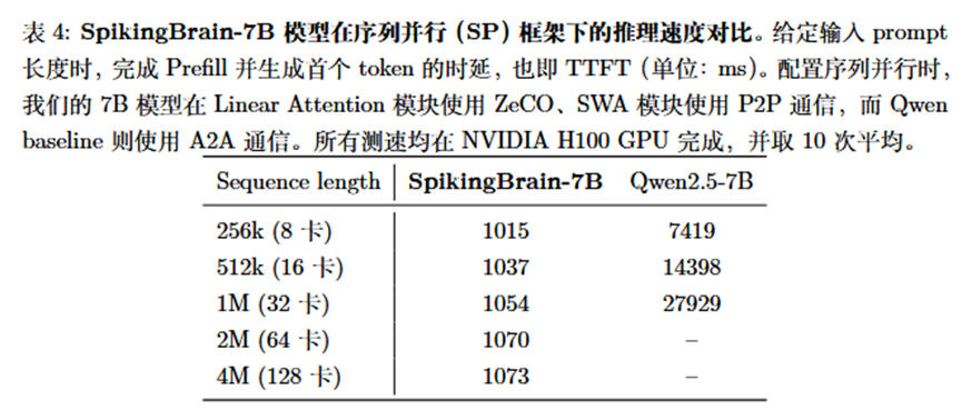 结果显示,相比于使用标准注意力和A2A通信的Qwen baseline,SpikingBrain-1.0-7B在512K和1M长度下TTFT(提交提示到生成第一个Token所需的时间)加速分别达到13.88倍和26.5倍,且随序列长度和卡数扩展具有几乎恒定的时间开销,在4M长度下Qwen已经无法评测,根据拟合scaling曲线,保守估计速度提升超过100倍(表4)。