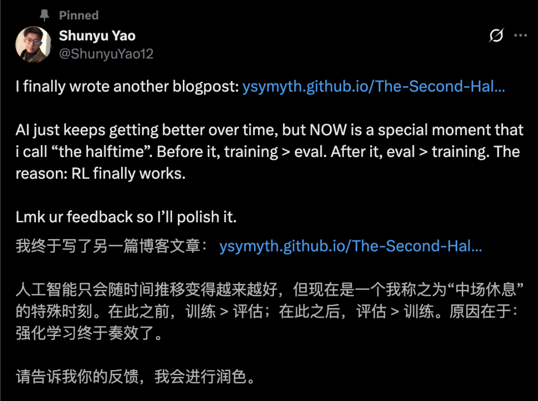 今年4月,姚顺雨还提出了对AI发展的独特观察: