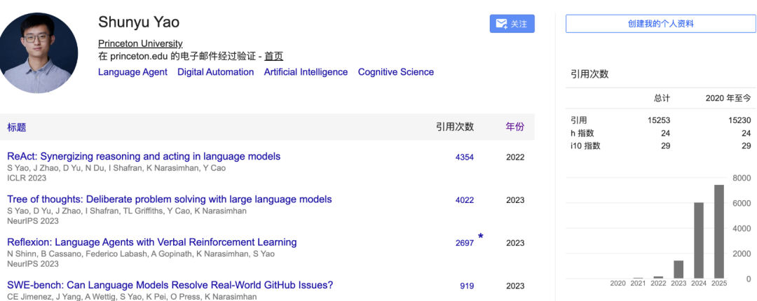 谷歌学术显示,ReAct和思维树引用次数已过4千次,个人总引用次数已过1万5千次。