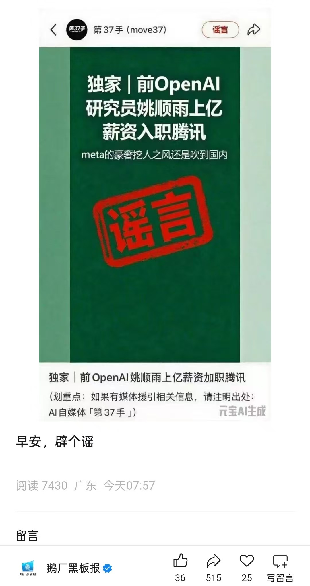 姚顺雨昨天被传加入腾讯,今早「第37手」和腾讯旗下的「鹅厂黑板报」正式辟谣!