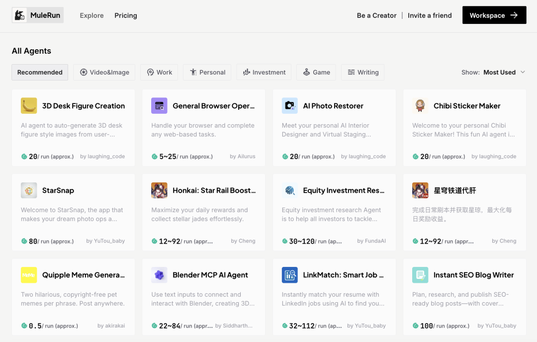 通过统一的入口,MuleRun聚合了类型丰富的Agent、全球创作者和海量用户,实现了一站式的Agent交易服务。