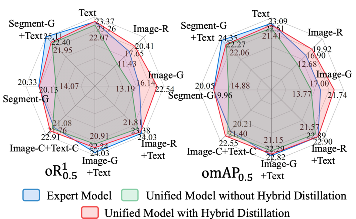 实验结果显示,使用混合模态蒸馏后 ,模型在弱模态处理上显著提升:Image-R提升8.98%,Image-G提升9.35%。