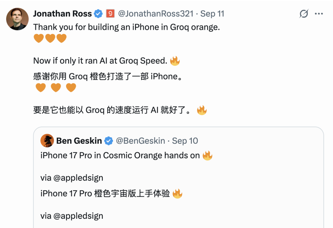 就在最近,CEO乔纳森·罗斯还调侃了一下iPhone的新配色是“Groq橙”。