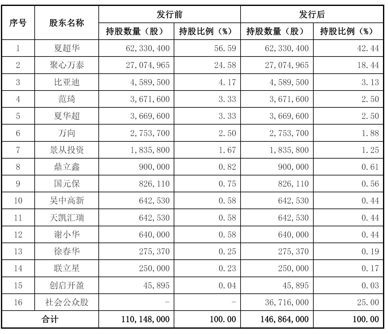 IPO后,夏超华持股为42.44%,聚心万泰持股为18.44%,比亚迪持股为3.13%,范琦、夏华超分别持股为2.5%,万向持股为1.88%,景从投资持股为1.25%,鼎立鑫持股为0.61%,国元保持股为0.56%;
