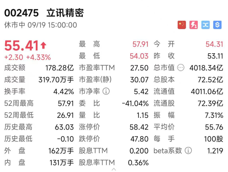 截至昨日收盘,立讯精密股价上涨4.33%,总市值4018.34亿。
