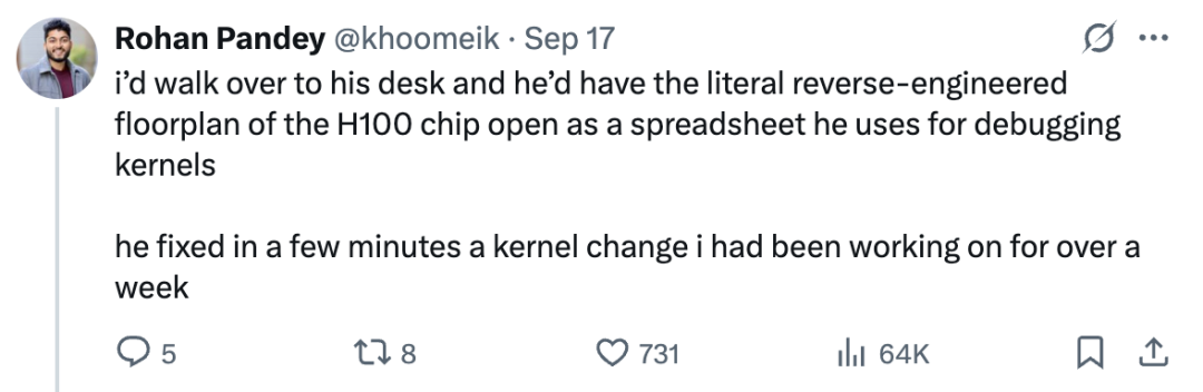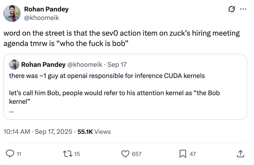 像CUDA内核这种基础工程对AI公司来说实在太重要了,因此这类技术人员在硅谷往往被视为核心机密,Bob本人大概率是不会亲口承认的。