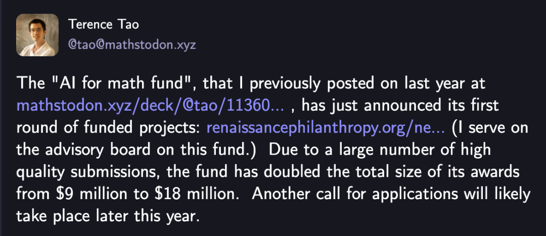 去年12月,陶哲轩表示同意加入AI数学基金(AI for Math Fund)顾问委员会。