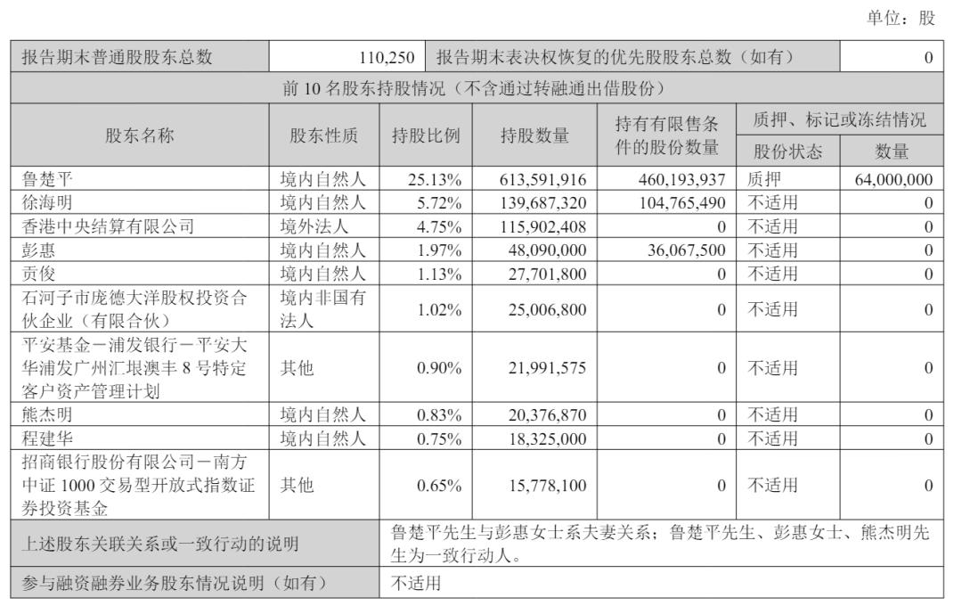 截至2025年6月30日,鲁楚平直接持股25.13%,徐海明持股5.72%,香港中央结算有限公司持股为4.75%,彭惠直接持股1.97%;