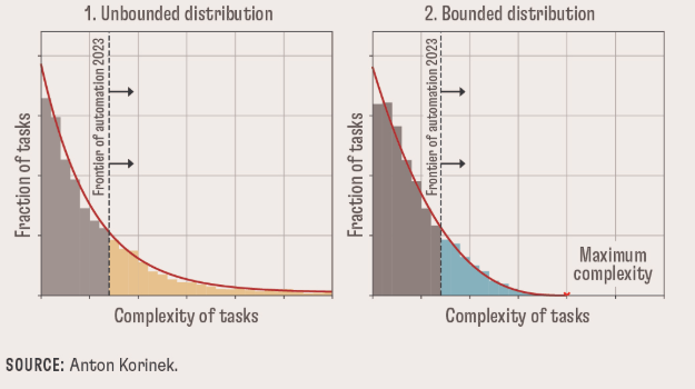 IMF经济学家Anton Korinek提出两种可能:如果任务复杂度没有上限(左图),自动化将无限推进,人类工作空间会被不断压缩;如果复杂度有上限(右图),自动化在某个点会停下,人类可能保留一部分永远不被替代的工作