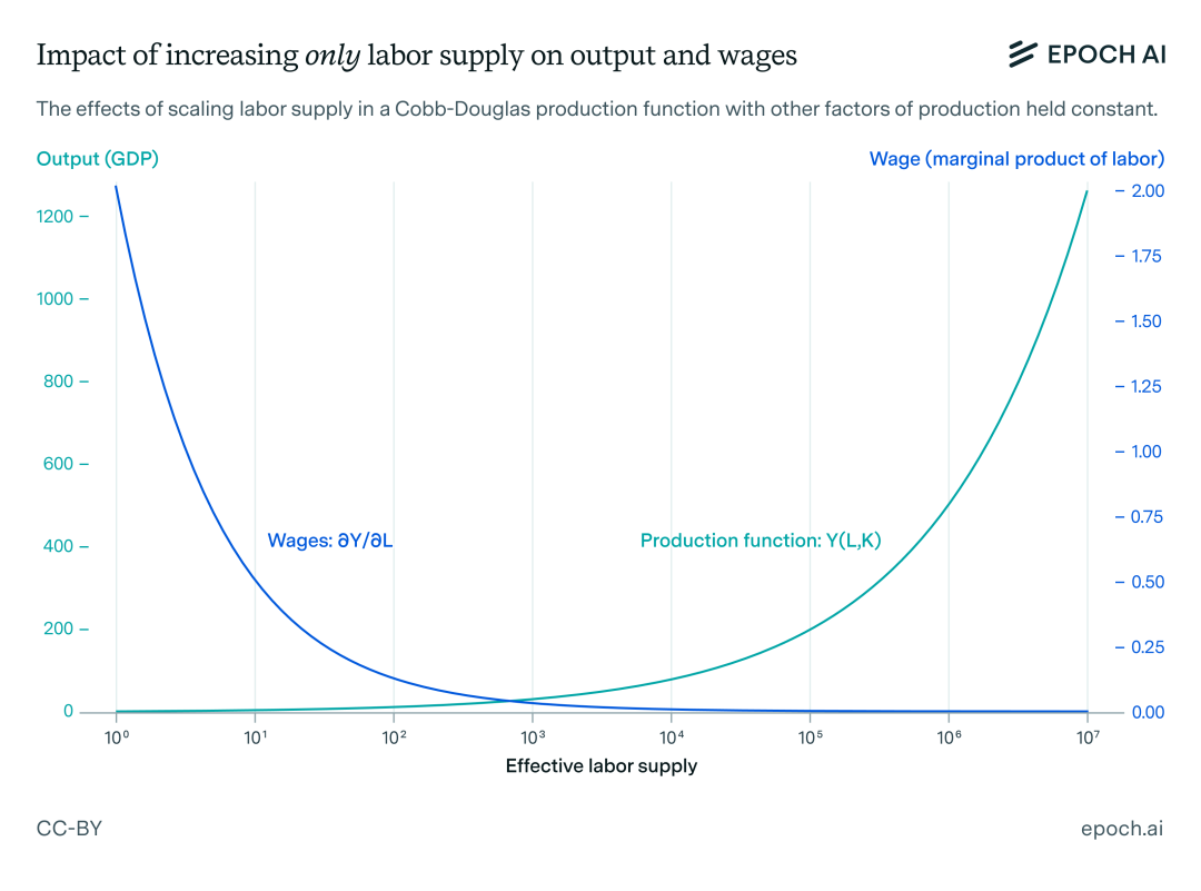 Epoch AI用Cobb-Douglas模型推演了一个结论:当劳动供给不断增加而其他生产要素不变时,整体产出会继续扩张,但劳动的边际产出(也就是工资)会快速下降并趋近于零。