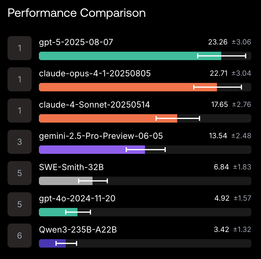 以Pass@1作为问题解决率指标,GPT-5与Claude Opus 4.1分别以23.3%和22.7%解决率领先。