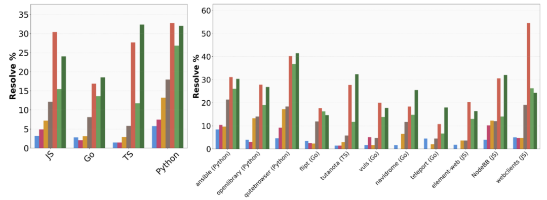 相较之下,JavaScript(JS)与TypeScript(TS)则表现波动较大,根据模型不同,解决率从0%到超过30%不等。