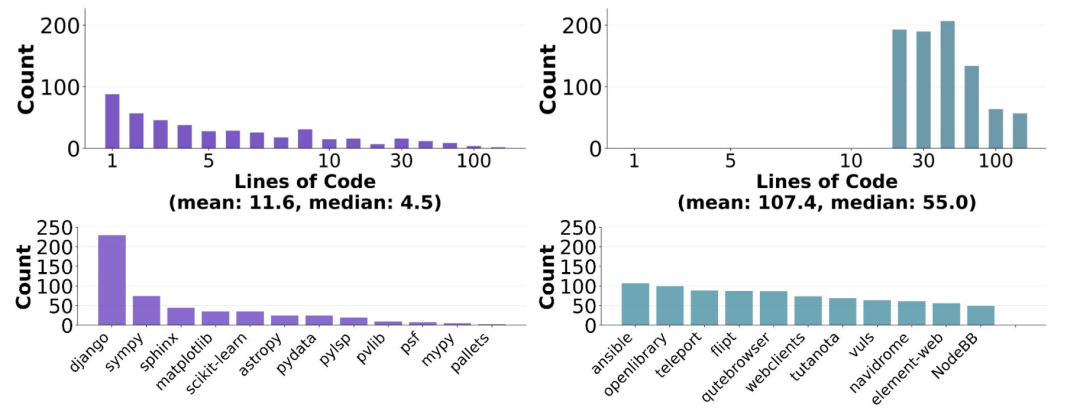 参考解决方案平均涉及4.1个文件、107.4行代码,所有任务至少改10行,超100项任务需改超100行。