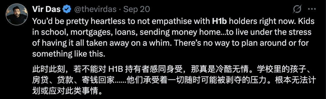 网友Vir Das认为,新规的出台,令H-1B持有者随时面临一切被剥夺的压力,因此应当对他们的遭遇感同身受。