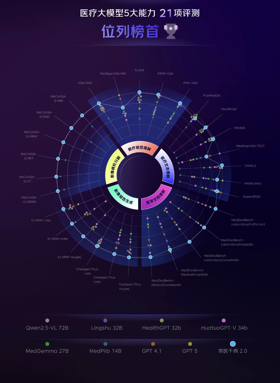 在涵盖医学影像病灶分割、报告生成、文档理解等5大能力的21项评测中,京医千询2.0的综合表现展现出领先优势。