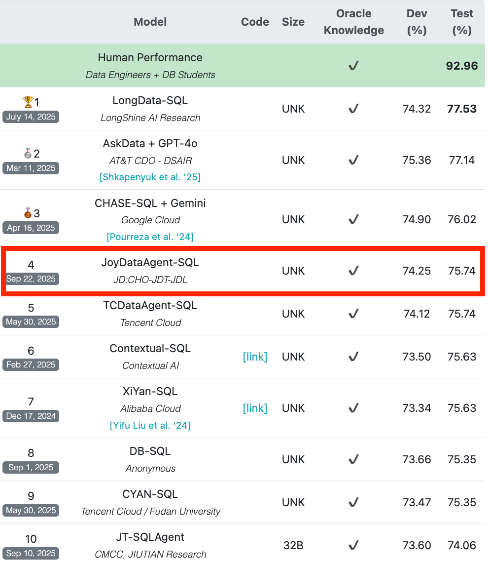 同时在权威自然语言转SQL评测基准BIRD-Bench上,JoyDataAgent-SQL Test集准确率75.74%,Dev集准确率74.25%。