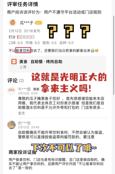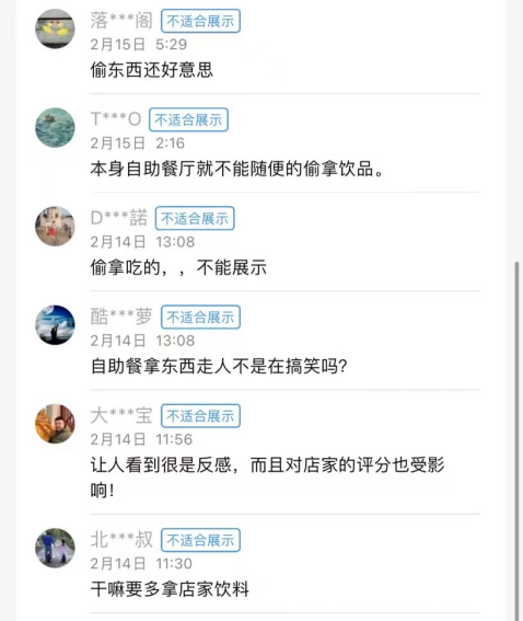 有的顾客去吃自助餐,试图把餐食带走时被拦下,一气之下吐槽道:“不让偷拿饮料回去了,还要我们当众把拿的都拿出来。”