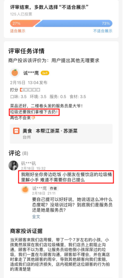 但大众评审团发现,其他消费者主动“做证”,涉事客人的孩子往餐厅垃圾桶里撒尿,服务员才提出自行清理的要求。面对素质堪忧的家长,73%的“赛博判官”判定,这条不合理的差评应当被隐藏。