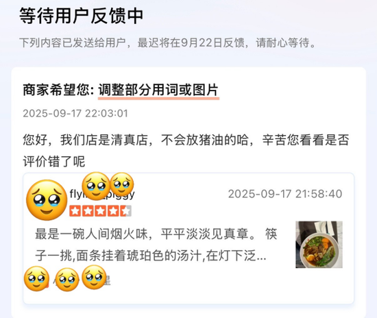 又比如,一位顾客洋洋洒洒上百字,以《舌尖上的中国》式的笔调赞赏一碗叉烧面,还给了4.5颗星。商家却开心不起来:自己明明是清真馆子,消费者却称赞“虾籽和猪油正悄悄交换着秘密”。