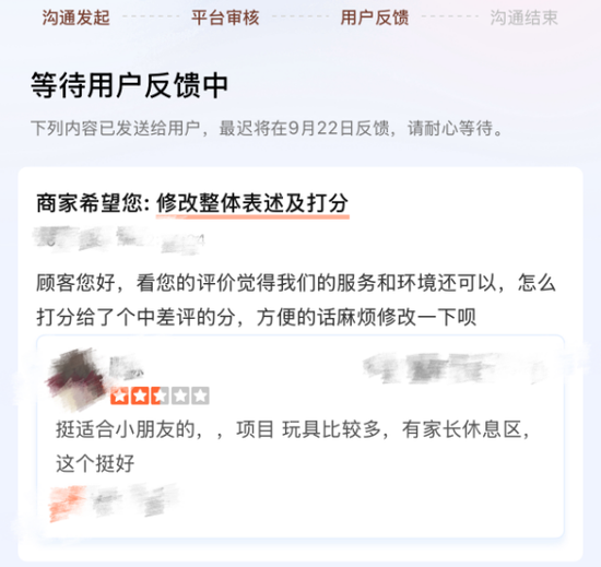 此外,我们还看到有商家晒出了一个大众点评的评价沟通机制。商家看到不合理差评,可以私下和用户沟通,说明情况和诉求,看看对方能否调整表述、图片和打分等。相比在评论区“叫屈”,或者直接上大众评审的“法庭”,餐厅老板多了一个和用户商量的路径。