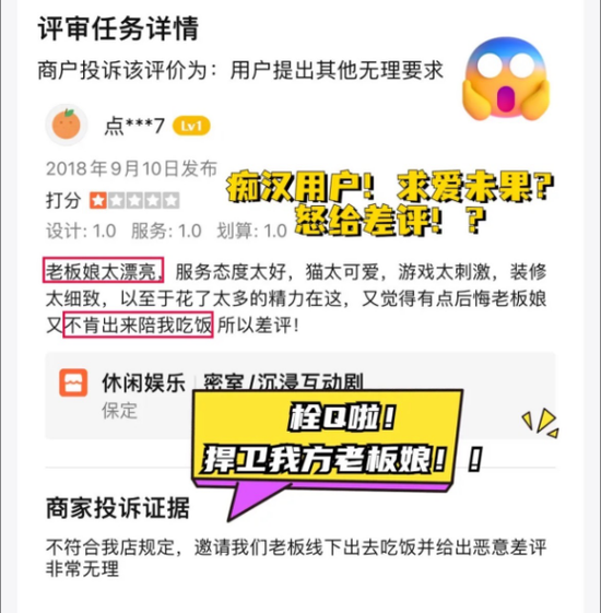 这不是段子,而是真实发生在某密室评论区的一幕。老哥到底是真心想约老板娘,还是只是开玩笑,已经无从分辨。但一星打分的负面影响是实打实的,就算不会让别的顾客跑路,也会拖累商家的搜索排名。