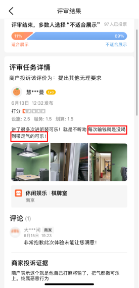 又比如,一位顾客吃完饭,回家后严重失眠,认为茶水有问题,“给个差评不过分吧”?大众评审团认为,喝茶本身就有可能睡不着,83%的人认为这条差评“不适合展示”。