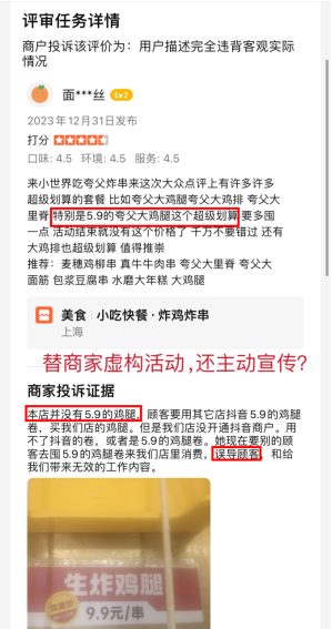 比如,顾客宣称餐厅有超级划算的5.9元大鸡腿,打出好评,鼓动大家去抖音团券、到店消费,“千万不要错过”。